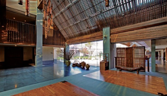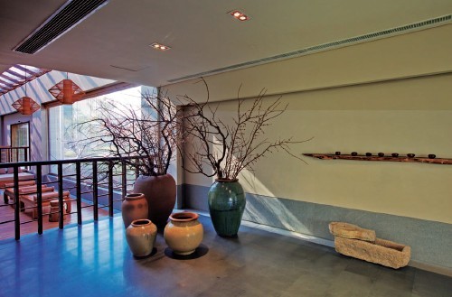 比起一般的豪華現(xiàn)代時尚會所,會所設(shè)計公司給人的自然樸質(zhì)感覺更接近佛堂,寬敞的各區(qū)場所,一株枯枝、一座石凳、一段木幾、一汪鵝卵石鋪就,搭配隨處可見的竹簾、屏風(fēng)、陶罐,處處充滿了盎然古意。從大廳到客房,沒有炫目的燈光,沒有奢華的大理石和拼花效果,只有青磚和木材的沉靜祥和。置身其中,眺望綿延的遠(yuǎn)山,輕輕撫摸青青翠竹,不用費力想象,古人的精致生活已經(jīng)呈現(xiàn)眼前。