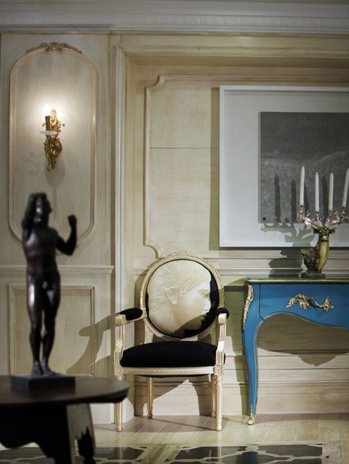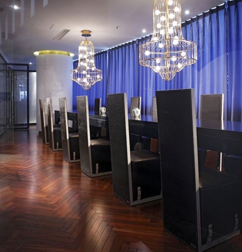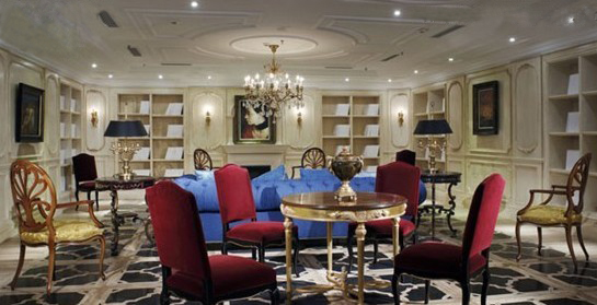 他們是造物的高手,能與神對(duì)話的使者。開(kāi)闊的大廳劃分為三種區(qū)域,兩組圍合沙發(fā)區(qū)域和洽談區(qū)。色彩上則是經(jīng)過(guò)計(jì)算的。背景的米黃色護(hù)墻,藍(lán)色的沙發(fā),酒紅色的座椅,不同比例的擺放著。體現(xiàn)了所有的原色構(gòu)成,視覺(jué)上飽滿豐富。同時(shí),象征著法國(guó)式的古典時(shí)尚,酒紅的波爾多,米黃的阿維尼翁城堡無(wú)不收斂其中。家具款式上采用了法國(guó)品牌RocheBobois,優(yōu)雅時(shí)尚,而空間用途更多體現(xiàn)了巴黎的某種沙龍文化?!?/font>