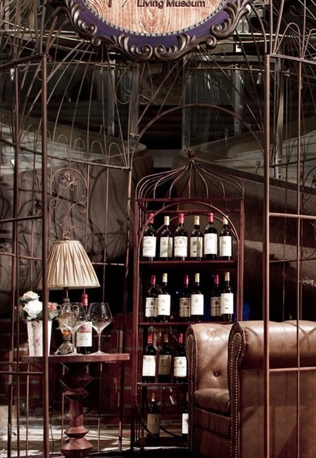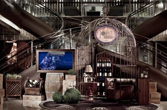 佇立大堂,望去3D式線條空間,干凈不失豐腴。香檳金梁柱駁接天花與復(fù)式樓地板,左右梁柱盤旋至天花平鋪“O”形修飾,邊緣相親,形成視覺效果“8”天花圖騰俘獲視覺關(guān)注維度,設(shè)計(jì)師將品牌字符進(jìn)行巧妙的空間修辭植入。左右梁柱分別由上而下呈“X”曲線設(shè)計(jì)空間落幕,從設(shè)計(jì)出發(fā),依托視覺影響力,植入“1982”的品牌之手,左右攤開,展現(xiàn)禮儀,恭候貴賓,襯托顧客群體的定位與消費(fèi)品質(zhì)。從做舊橡木地板、錯(cuò)落有致的木質(zhì)紅酒桶、香檳色金屬鳥籠、墻射燈飾的設(shè)計(jì)選材運(yùn)用無一不與質(zhì)樸、簡約、高私密的品牌內(nèi)涵有著強(qiáng)烈的視覺心理暗示。