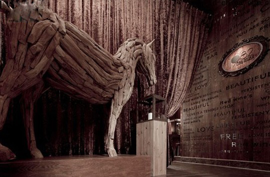 轉(zhuǎn)角,做舊木箱堆疊,皮質(zhì)復(fù)古手提箱承載:紅酒瓶與奶白花束、木質(zhì)老相框、純白蠟燭勾芡做舊簡約鐵質(zhì)燭臺,不規(guī)則木質(zhì)拼組的靜態(tài)動物“馬”飾物,獨(dú)立體的空間交融,多國元素的融合,設(shè)計(jì)手法由單純的裝飾升華至與紅酒文化所提倡的“無國界藝術(shù)裝置”,透露品牌專注“圈子”文化的確立。墻面凹陷木質(zhì)鏤空字體設(shè)計(jì)與燈光聚焦折射“1982”的方向運(yùn)用,設(shè)計(jì)師在有限的空間內(nèi)順從設(shè)計(jì)之道充分彰顯對于設(shè)計(jì)、藝術(shù)、商業(yè)、閱歷、生活的駕馭,從細(xì)節(jié)布局表達(dá)品牌對于賓客權(quán)限的細(xì)致服務(wù),全城唯一一家管家服務(wù)生活館,無處隱匿的謙虛內(nèi)斂的雅致情懷。