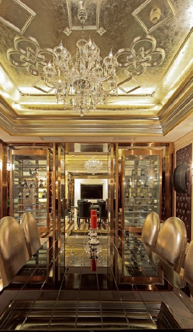 意式貴賓室不僅僅是一件設(shè)計作品。意大利的奢華風(fēng)范和設(shè)計中的時代感,更流露著對夢想的寫意—讓客戶成為名利場的貴族??臻g設(shè)計以意式奢華和浪漫為主軸。此貴賓室分為雪茄會客區(qū)及用餐廳。頂棚以極度奢華的線條雕花與金銀箔搭配,交叉點(diǎn)綴在墻面的整體式皮革上。搭配線條線板刻花、金鏡、現(xiàn)代裝飾手法,將繁復(fù)的設(shè)計簡潔化。家具以最精致的設(shè)計語言簡化線條,其典雅的造型和雍容大度的氣質(zhì),成為意大利風(fēng)格最好的注解。低位的燭臺、頂棚上的鏡面把空間裝點(diǎn)得奢華而夢幻,貴族階層的生活由此呈現(xiàn):他們談?wù)撋?、?jīng)濟(jì)、文學(xué)等;品酒的人士搖晃著水晶杯,聞著酒香,品味著尊貴。