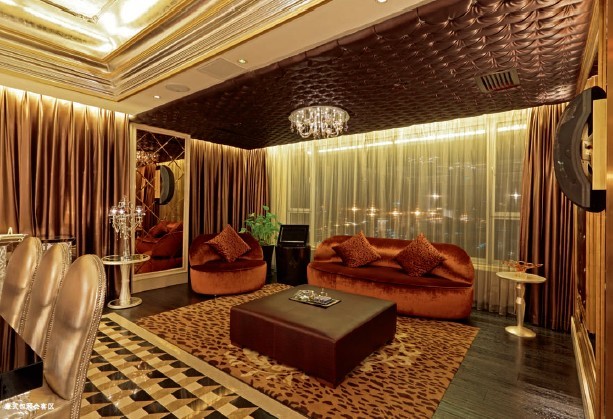 真正的奢華絕非金碧輝煌、堆金砌玉,藝術(shù)與品位的相映生輝,才能成就殿堂級的奢享。中式貴賓室為本項(xiàng)目的設(shè)計重點(diǎn),此空間為中式風(fēng)格,空間分為會客區(qū)及用餐區(qū)??臻g為開放形式呈現(xiàn),整體設(shè)計并非以傳統(tǒng)中式表現(xiàn),而以簡約并穩(wěn)重的方式展現(xiàn)。室內(nèi)頂棚用銀箔面疊加并旋轉(zhuǎn),配合華麗的水晶吊燈,把空間裝飾得流光溢彩。墻面以黑檀木與茶鏡虛實(shí)結(jié)合起來表現(xiàn)空間的穩(wěn)重,并以畫龍點(diǎn)睛之形式,將中式的百寶閣用金屬材質(zhì)點(diǎn)綴其間。為增加中式底蘊(yùn)及視覺沖擊,采用后現(xiàn)代主義手法,將簡約式奢華的歐式家具及水晶燈與現(xiàn)代手法中式家具相互結(jié)合,圍合出一個氣派的空間。大量皮革、綢緞、馬鞍縫法的皮毛、印花織物的運(yùn)用,讓人一進(jìn)入仿佛跌進(jìn)奢華的海洋。這里的家具的奢華可以被稱為“頭發(fā)絲上的奢華”,每個細(xì)節(jié)都展現(xiàn)得那么盡善盡美。