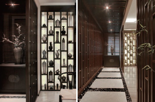 這是一間專為修心養(yǎng)性及收藏會友所量身定做的私人場所。空間以傳達輕松、舒適、放松的氛圍為目的。推門而入,“綠竹入幽徑,青蘿拂行衣”,這全靠兩旁的木質格柵營造氛圍。這個木質格柵的設計靈感來源于竹子,借用竹節(jié)的形式,設計了這種木質格柵的樣式。腳底的踏石加上青嫩的竹葉,帶給人一種自然親切、平靜放松的感覺,悠閑、隨意的生活意境盡顯眼底,濃郁的東方禪意氣息隨之而來。
