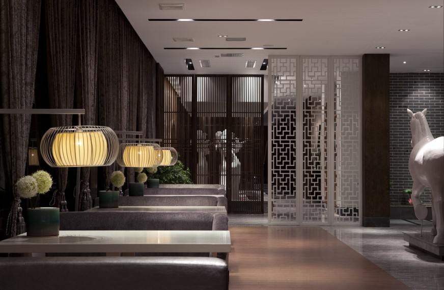 新中式簡約風(fēng)格在會所設(shè)計中穿插運用,呈現(xiàn)一種兼容并蓄的美。通過把所謂古典語匯幾何化、圖像化、對比化、節(jié)奏化等方式轉(zhuǎn)化。在線條上化繁為簡,在色調(diào)上,講究穩(wěn)重而貴氣的單一色彩,在空間語言傳播上,主張厚重、莊嚴(yán)、質(zhì)感與奢華。