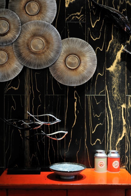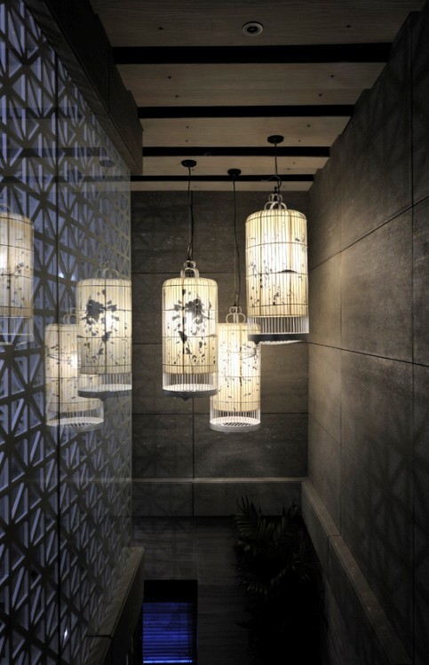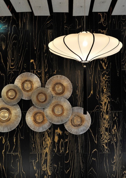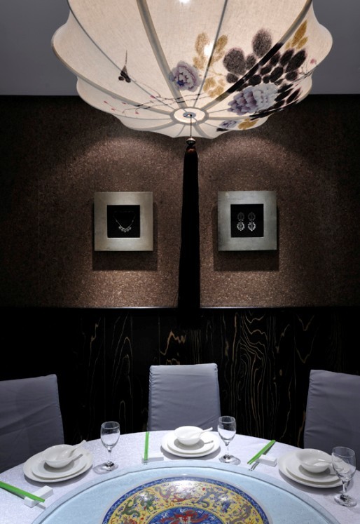 在墻面的配飾上,餐飲會所設(shè)計公司明確了概念:用包廂主題“金木水火土”相呼應(yīng)的裝置性配飾來完成。圍繞這五個主題概念的家具與陳設(shè),包括有工廠定制、手工制作等多種元素拼接,如定制的水晶飛魚吊燈、景德鎮(zhèn)窯變工藝手工陶瓷手盆、為了達到傳統(tǒng)意蘊自己潑墨而成的樓梯間燈飾等等,空間中的每一個物件都充滿了個性特色,并且成功控制在極低的成本里,是權(quán)衡美感與開支之后的最合適方案。