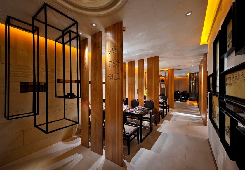 設(shè)計師在入口內(nèi)部開辟品茗區(qū),以明式家具的硬朗造型傳達(dá)質(zhì)樸、輕松的氛圍;由大小不一的原木塊組合而成的屏風(fēng)上刻著唐代古詩“春江花月夜”的節(jié)選,原木書架和陳列柜分別放置陶瓷工藝品和傳達(dá)養(yǎng)生藥膳概念的中藥材、菌菇標(biāo)本。而滿置葡萄酒的酒文化包間、由幾張組合拉伸 處理的藥膳餐椅、室內(nèi)印象派風(fēng)格的水墨畫作等現(xiàn)代元素則傳遞出更加多的審美主張。