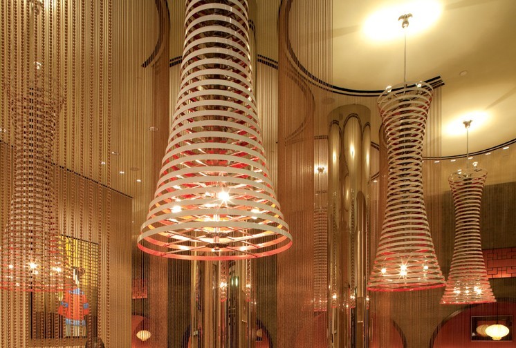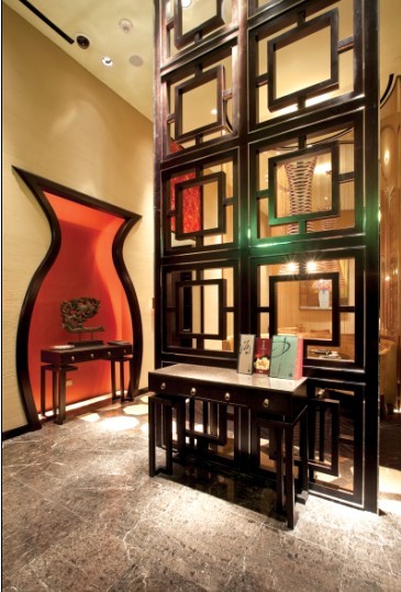 入口處如中國花瓶般的自動玻璃是開啟時尚中國餐飲的大門。經(jīng)過黑色華麗的蟑螂便進入休閑區(qū),地板的透明玻璃搭配天花板飾,感覺好像走在天花上顛倒了天地一般。包廂的門框猶如燈籠形狀,裝潢上的視覺鋪成相當用心,給人溫馨舒適的感覺。由珠簾圍繞的圓桌包廂,其頂上的特色吊燈由鐵片彎繞而成,簡單的構(gòu)造下卻有著解構(gòu)的視覺感。