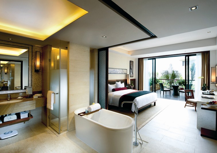 會(huì)所與眾不同之處在于將泳池設(shè)計(jì)在一層房間的門口,開門就能夠跨入泳池,除此之外浴缸擺在房間中央,可以邊泡澡邊看海景,十分浪漫。同時(shí),為盡量滿足不同住客的需求,希爾頓逸林度假會(huì)所還在房間中央的“浴缸元素”的基礎(chǔ)上,加了兩扇移動(dòng)隔斷,隔斷拉起,就是一個(gè)私密的衛(wèi)浴空間。