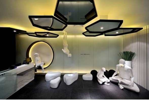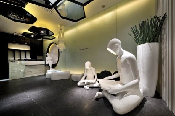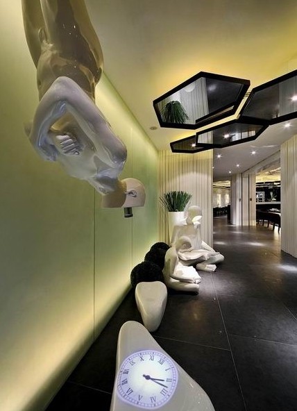 在本餐飲會(huì)所設(shè)計(jì)中最突出的亮點(diǎn)之一便是大廳的造型與創(chuàng)意,以玻璃鋼雕塑或站或坐的各異姿態(tài),加上乳化玻璃發(fā)光墻、圓月造型 ,時(shí)尚現(xiàn)代感與東方氣質(zhì)的碰撞,為整個(gè)餐廳增添許多各異的色彩。