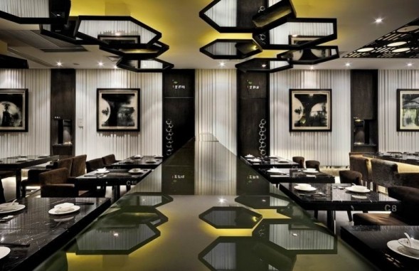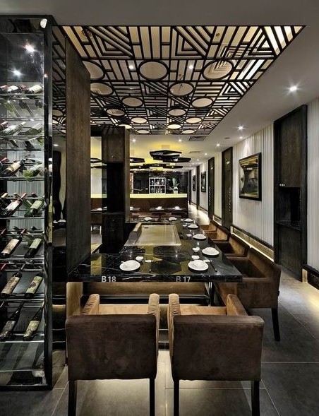 大門(mén)左側(cè)店名“望江南”旁佇立的兩株蓮花,將江南的風(fēng)韻表現(xiàn)得淋漓盡致。黑與白的空間,加上屋頂鏡面設(shè)計(jì),令本來(lái)不高的層高顯得不再擁擠。咖啡色調(diào)的家具陳設(shè)和大理石臺(tái)面互相呼應(yīng),墻面的造型也運(yùn)用了凹凸不平的鏡面材質(zhì),強(qiáng)烈的沉穩(wěn)感突出了餐飲會(huì)所的檔次與定位。