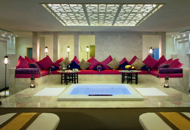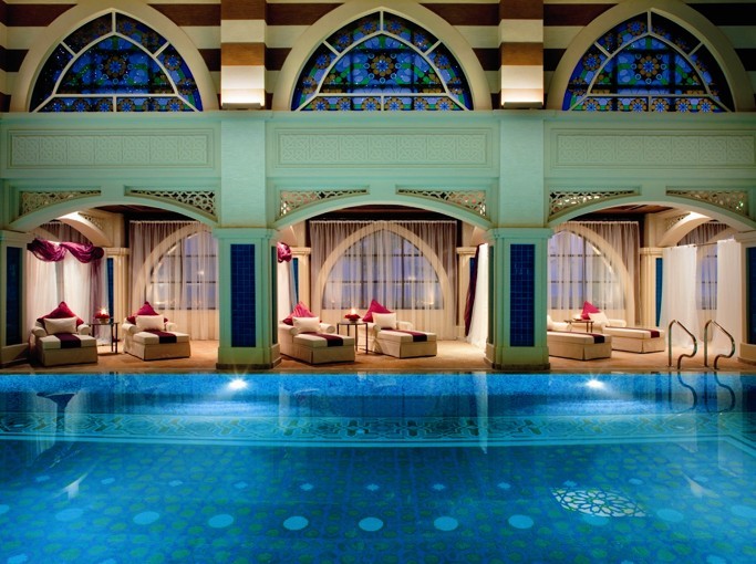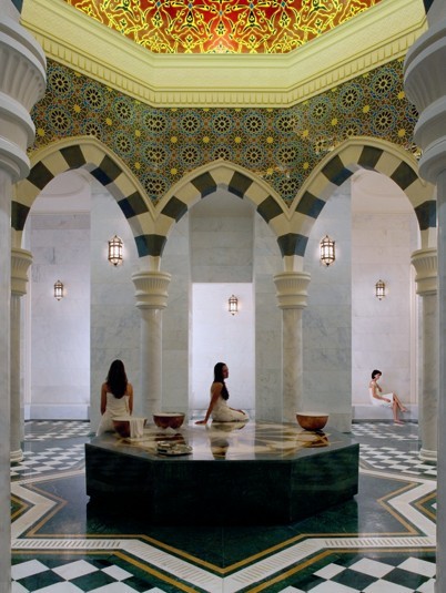 步入洗浴會所大堂,一條長達200米的回廊展現(xiàn)眼前,歌德式尖拱也是設(shè)計的一個亮點,回廊天花設(shè)計和拱門遙相呼應(yīng),并用奢華的枝形吊燈加以裝飾。給人一種宮廷的感覺。地面設(shè)計材料是黑白大理石,此類大理石源于土耳其當?shù)兀厦骘椧?3顆綠松石奧斯曼星,這是奧斯曼藝術(shù)的一大主要特色。整個酒店的設(shè)計運用了大約30000平方米的天然大理石。