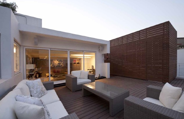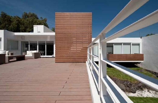 這座房子由相互交叉的兩部分構(gòu)成。第一部分位于長約20m 的巨型火山巖上。這個長方體形結(jié)構(gòu)中設(shè)有起居室、餐廳、電視房、廚房和書房,這間書房為業(yè)主的妻子所有,她是一位作家和一個“書癡”。從外觀上看,第二部分位于第一部分的下層,其中設(shè)置了兩間臥室和一間游戲室,該部分結(jié)構(gòu)的上面還設(shè)置了一處大型的露天平臺。