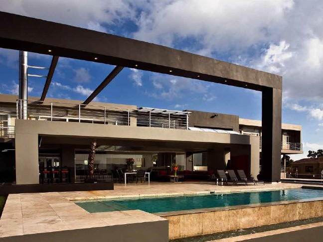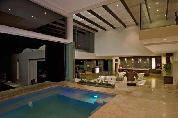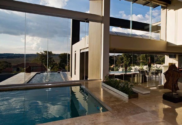人們進入大廳,就可以看到開放式的休閑娛樂區(qū)、餐廳和廚房,再穿過無框玻璃門就是寬敞的陽臺和游泳池。娛樂室和陽臺之間的墻壁為玻璃結(jié)構(gòu),可以完全敞開。廚房與陽臺直接相連。廚房后部有餐具室、冷藏室、碗碟洗滌處和洗衣房等,廚房與車庫相連。樓上一側(cè)為主臥和浴室,它們被含壁爐的矮墻分隔開來。浴室設置有淋浴裝置、廁所和浴盆等,浴室一側(cè)與陽臺之間由高高的玻璃滑動門分隔成兩個空間,透過玻璃滑動門可以欣賞野生動物保護區(qū)的開闊美景。