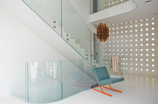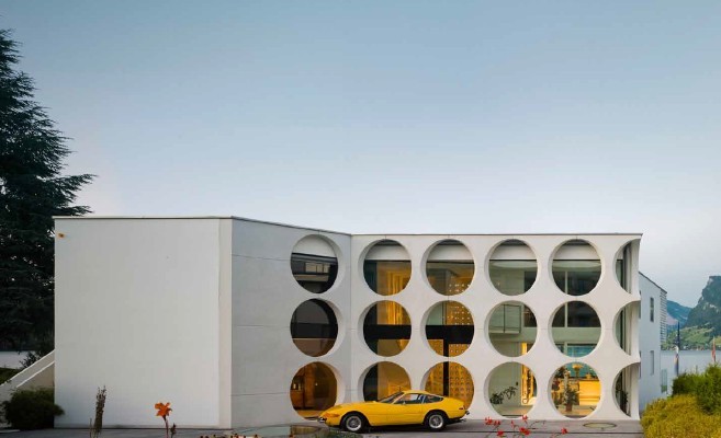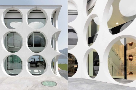 這座私人的正立面和朝向湖畔一側(cè)的立面都極具表現(xiàn)力。該建筑面向皮拉圖斯山,白色混凝土墻面上有多個圓形的開口,透過這些開口,可以欣賞到戶外的景色,也可以透過一層的一個圓形開口看到室內(nèi)的休息區(qū)、樓梯等設施。建筑湖畔的一側(cè)有一處玻璃結(jié)構(gòu)的涼亭,在這里,人們可以觀賞美麗的景色。