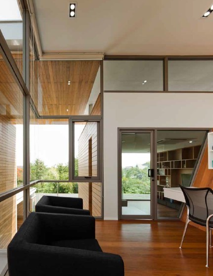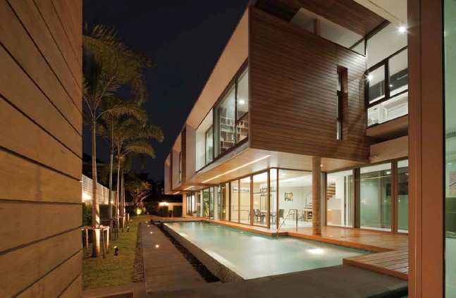 本案如果被設(shè)計成大的塊狀結(jié)構(gòu),則不利于房屋的通透性,也會阻礙自然光的照射,因此, 這座建筑中的所有房間被分隔開來。設(shè)計師創(chuàng)造了一些半戶外的空間,并利用這些空間將室內(nèi)外 空間聯(lián)系在一起。每個空間在設(shè)計上都應(yīng)用了一些自然元素,如水、草、木制品等。