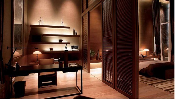 無論是主臥還是次臥都充分結合了地形,將臥室頂部設計成一個傾斜的坡度。主臥中大量采用了木制屏風,線條簡單的書架和書桌,與地毯上的條紋相互呼應,讓人感覺靜雅而溫馨。整棟私人會所裝修的高檔、溫馨又有貼合人性本質(zhì)的盈動與大氣。