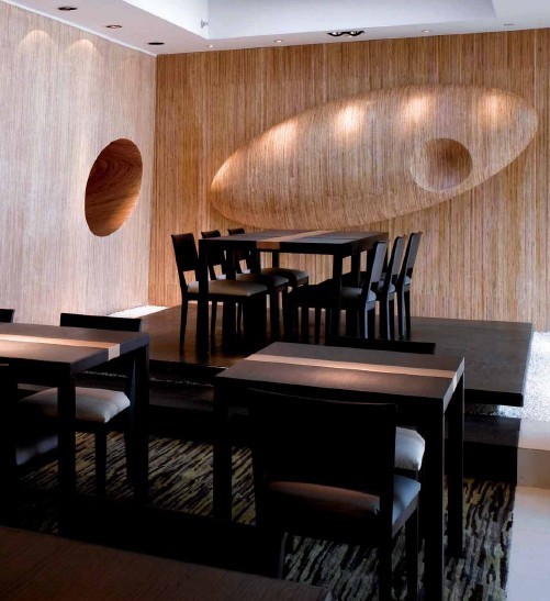 傳統(tǒng)觀念認為藝術(shù)應(yīng)該表現(xiàn)在墻上或地板上,而本餐飲會所設(shè)計將挑戰(zhàn)這一傳統(tǒng)。膠合板采用人工制作放于三大藝術(shù)作品中由l000塊膠合板制成大型木質(zhì)墻,2個打孔的橢圓形。膠合板純手工制作成大型半圓體和波浪形壽司柜臺。