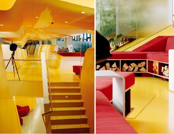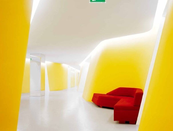 這種應(yīng)用于地面和天花板的沙丘結(jié)構(gòu)在樓梯處也有所體現(xiàn),通過(guò)臺(tái)階將各個(gè)樓層和地下的就診室連接起來(lái)。橫向突起形成的圍墻,使中間過(guò)道看起來(lái)如同峽谷般。其他房間都集中在個(gè)區(qū)域,分別用于防護(hù)、手術(shù)、X光和就診。這個(gè)區(qū)域通過(guò)間大會(huì)議室將醫(yī)療會(huì)所和獨(dú)立的實(shí)驗(yàn)室連接起來(lái)。醫(yī)生和職員有專用的樓梯可以通向各樓層。除了個(gè)鋼框架外,就診室之間都采用無(wú)框架玻璃作為隔斷。地面采用的橙色與將醫(yī)療會(huì)所設(shè)計(jì)成沙灘景象的理念相呼應(yīng)。