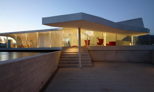 屋頂?shù)谋砻嫦聵?gòu)成了一個(gè)“X”的形狀,宛如兩個(gè)分支延伸至湖中。其中一個(gè)是凹面的花園,是由岸邊到會館的主入口,低于湖面1.3米處延伸,使游客們感覺仿佛穿過湖水才能到達(dá)會館一般。會館的另一端是游泳池,注入循環(huán)流動的湖水并保持水面與湖面相平,模糊了室內(nèi)與室外、建筑與自然之間的界線。