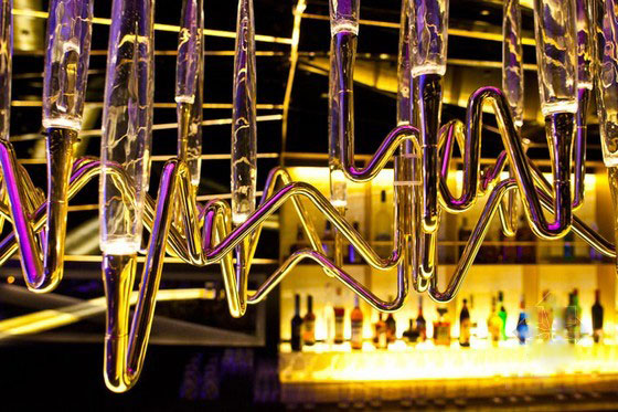 金箔壓花革的暖色調(diào)與布滿(mǎn)穗飾的餐椅,營(yíng)造出高貴舒適的音樂(lè)會(huì)所空間。閃爍的反射光從黑色玻璃平面上投射出來(lái),在音樂(lè)空間不斷跳躍,閃閃發(fā)光,與奢華的整個(gè)音樂(lè)會(huì)所裝潢呼應(yīng)。此外,會(huì)所設(shè)計(jì)公司還采用II Pezzo Mancante線(xiàn)性L(fǎng)ED吊燈,進(jìn)一步加強(qiáng)空間的閃亮效果。金色涂鴉與水晶蠟燭構(gòu)成6.1米長(zhǎng)的緞帶,彷如一個(gè)閃閃發(fā)亮的華蓋,覆蓋在主吧臺(tái)上方。