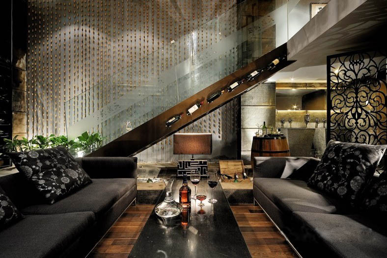 一樓入口的錐形柱做成由夸張變形的大“橡木塞”重疊而成的形狀,它既是純粹的裝飾片段,又是一種時尚的演繹;洗手臺旁放置著裝飾品與酒杯的“高幾”,竟是一個古樸的橡木酒桶,它毫不隱晦地表現(xiàn)著其率真與坦誠的面孔;而用軟木塞串成的簾子則成為了一大面積的背景墻,為我們帶來了新鮮的視覺體驗。當(dāng)射光打在上面時,仿若滿墻的燦爛繁星,遠觀著則又像折射著光的瀑布,似乎當(dāng)一陣風(fēng)吹過,能看到晃動的簾子后藏著若隱若現(xiàn)的寶藏。
