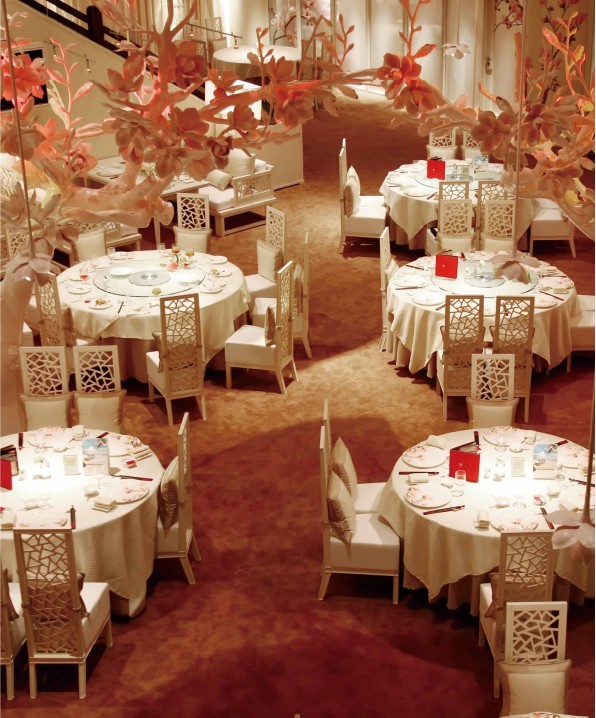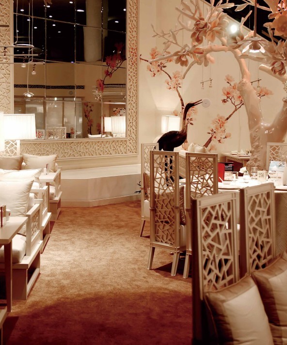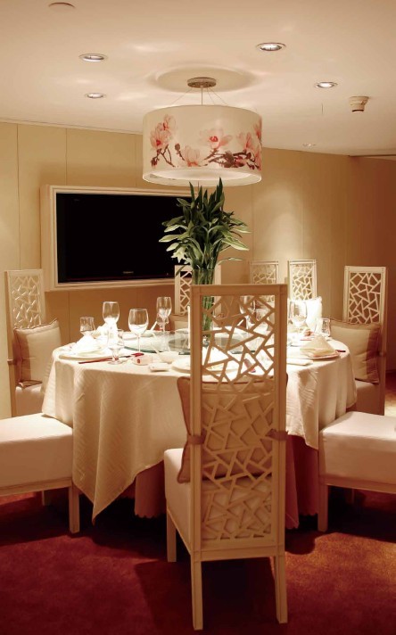 玉蘭花的淡雅美麗氣質(zhì)非常符合中國傳統(tǒng)文化的美學(xué)觀,因此很受國人喜愛,春秋時代的詩人屈原的《離騷》中就有“朝飲木蘭之墜露兮,夕餐菊之落英”.幾棵玻璃鋼制成的玉蘭樹放置于大廳之中,白色樹干,打上粉色燈,介于超現(xiàn)實與荒謬之間,但是又很真實。天花上懸浮著大片大片的玉蘭花瓣,或者是大朵盛開的木雕花。大量的杏粉色,從家具到四壁,更增添了這種夢幻感就餐氣氛。