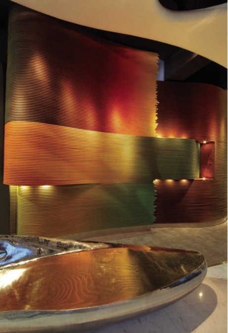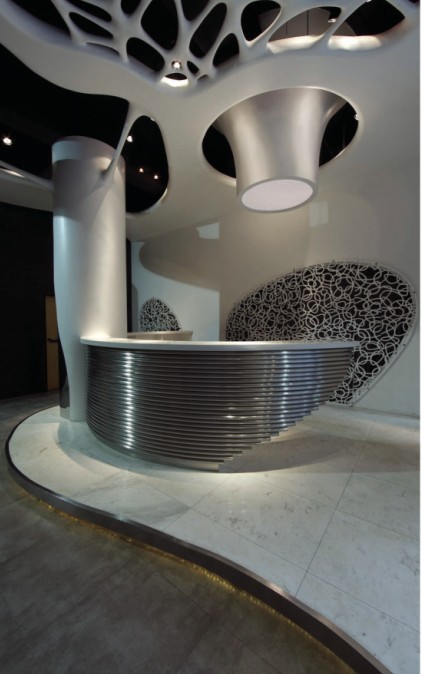 從某種程度上講,不銹鋼轉(zhuǎn)化了異形椅在通常經(jīng)驗下的物質(zhì)內(nèi)涵,它更多的從功能向形式上做了一次大膽突破。而軟雕墻則采用了PVC塑料管外纏尼龍線再刷丙烯涂料的方法,使得整個空間在視覺上得到更加愉悅的刺激。室內(nèi)也大膽保留了原建筑部分墻體與新構(gòu)筑的藝術形態(tài)形成新舊反差。同時也更加突出了雕塑般的流體結(jié)構(gòu)。整個水療會所空間完全沒有老建筑改造的跡象,最終的藝術效果得到大家的一致認可。