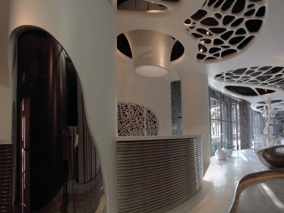 藝術水療會所的形態(tài)控制正是依據(jù)這一心理過程的把握,它居于似與不似之間,像與不像之中,有重有輕,有疏有緩,很好地創(chuàng)造了一次嶄新的超自然體驗。這種體驗仿佛把我們置身于未來的意象自然之中,它凝固了我們生命的機體,融化了人與空間的交流,也融化了我們精神所向往的境界。