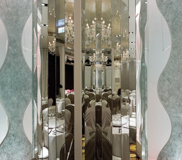 為配合結(jié)婚新人即興演出的各種橋段及短劇,宴會(huì)空間則采取直接表演的劇場(chǎng)概念呈現(xiàn)。用剛性交錯(cuò)的線條詮釋的宴會(huì)廳,其色調(diào)采用較低沉色系鋪陳空間氛圍,炫麗多層次的燈光變化揮灑于天花板及壁面襯底的玻璃馬賽克上使其幻化成極具變化的屏幕。菱形燈盒則隨著表演劇情起落漸變光影凝聚眾人目光。另一宴會(huì)廳則以柔曲的立面形體呈現(xiàn),運(yùn)用多層次的玻璃造型將光影層次染色其中,透過(guò)凈透的表面材質(zhì)將空間渲染出極具舞臺(tái)張力的表演背景。將燈光影音系統(tǒng)整合于整體會(huì)所設(shè)計(jì)中,隨著事件起落上演一幕幕人與空間的情境秀。
