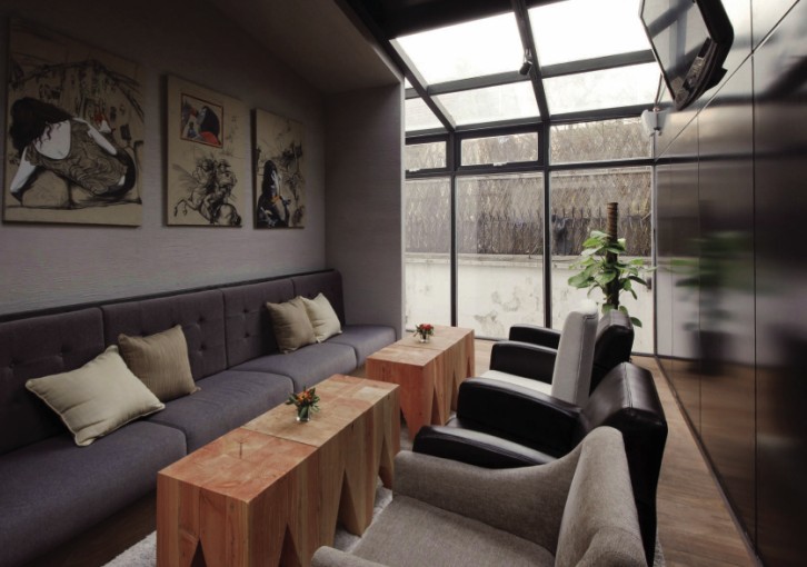三個(gè)從屋頂懸下的巨型玻璃罩其實(shí)是音箱,也就是說(shuō),存這件玻璃屋內(nèi),你可以帶自己的音樂(lè)來(lái)休閑,營(yíng)造屬于自己的小空間而彼此不會(huì)打擾到。相對(duì)正式的會(huì)談區(qū),色調(diào)是黑、略深的木色,以及少許金色。內(nèi)里的兩間包房,分別用白色與深木色為裝飾,給人以不同色調(diào)的沖擊感。