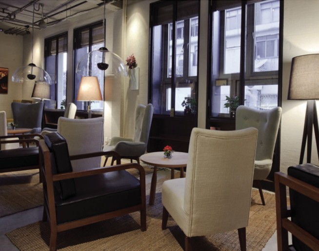 商務(wù)會(huì)所的開(kāi)放空間被分成4個(gè)區(qū),右邊與中間是適合就餐的座位,左側(cè)沙發(fā)、小圓桌適合與朋友小酌,一般情況下這就是商務(wù)會(huì)所餐廳區(qū)域開(kāi)放區(qū)的全部,會(huì)所設(shè)計(jì)公司對(duì)本案的構(gòu)思可謂別有洞天。最左往里走,是玻璃房,除卻放了不少植物外,中間有個(gè)裝了壁爐的書(shū)架,從各地搜回的老皮箱、旅游手冊(cè)成為擺設(shè),原色木幾周圍放著米色、灰色的沙發(fā),自然光線充足,看起來(lái)更像個(gè)獨(dú)立的咖啡室。