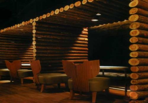 走進暖區(qū),入口設計以柔軟的毛皮展開,縱橫交錯的木條堆砌出柴枝感覺的墻,暗紅的燈光從四邊滲出,包裹著座位空間,營造出人們在寒冬圍在火爐邊取暖和溝通的氛圍??ㄎ徊糠值脑O計是用原木樹干建造出來的小木屋,充滿溫馨。
