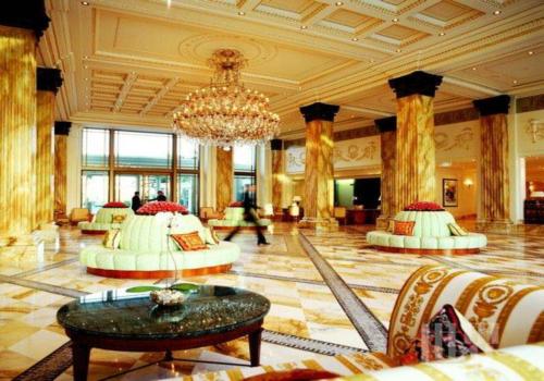 “More Is More”,酒店的廣告語異常高調(diào)張揚(yáng),一如范思哲服裝的風(fēng)格。這里極盡奢華之能事,金碧輝煌、性感耀目,大堂里懸著705千克的枝形吊燈令人眼花繚亂,歡迎來到范思哲的宮殿。