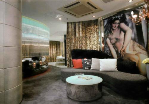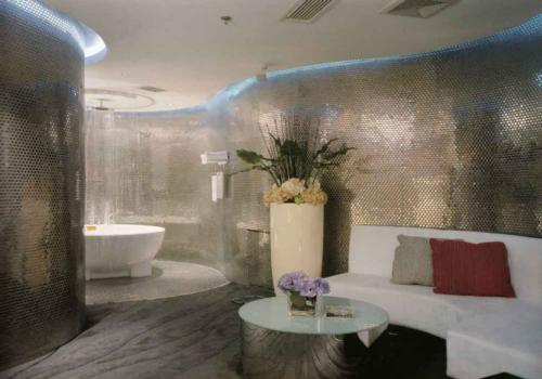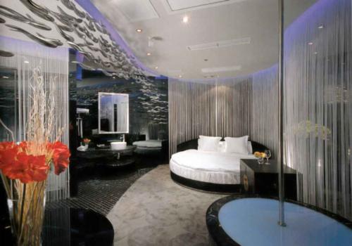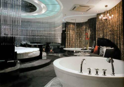 房間采用了全開放式的設(shè)計,衛(wèi)生間、睡床區(qū)及休息沙發(fā)區(qū)都以虛化的空間來劃分,通過相互的穿透和重疊來實現(xiàn)業(yè)主的訴求,既有精品酒店的華貴,又有KTV酒吧的魅惑。