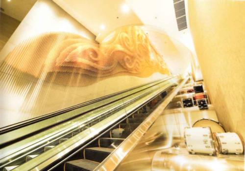 進入大堂,迎面而來的是奪人目光的裝飾墻。墻面又印有藝術(shù)圖案的半透明織物覆蓋,內(nèi)側(cè)擺放著各種裝飾品 ,同步程序控制下的前側(cè)射燈和隱藏式重點照明制造了一種動態(tài)的從朦朧到清透的照明效果,將墻內(nèi)的裝飾品逐漸顯現(xiàn)突出。