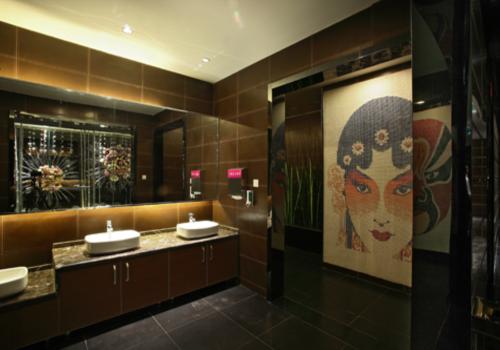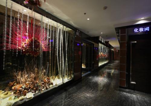 在公共空間和包間設(shè)置了大大小小不下30個景觀,每一個景觀都有一個吉祥的寓意,像一進(jìn)大廳的“荷塘月色”,收款臺的“花實同生”,走廊的“珠園玉潤”,“節(jié)節(jié)生輝”,“一簾幽夢”,自助餐的“花樣年華”等等。