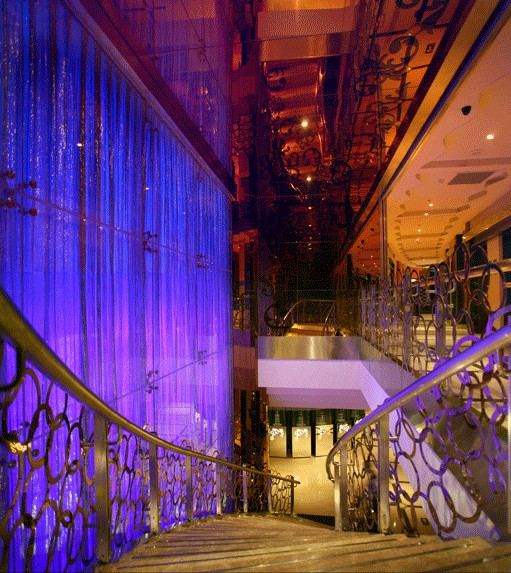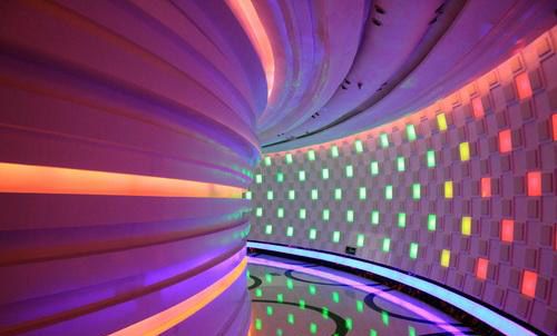 現(xiàn)在娛樂空間設(shè)計中運(yùn)用最多的是七彩LED燈。很多的KTV設(shè)計案例采用LED燈,創(chuàng)造出了一個個空間神話。例如,一個經(jīng)典的KTV設(shè)計案例,在麥樂迪南京山西路店設(shè)計師在玻璃幕墻內(nèi)部布滿數(shù)以萬計的點狀七彩LED燈,形成一片光墻,透過鋁制金屬簾照射出來,仿佛透出了震憾。