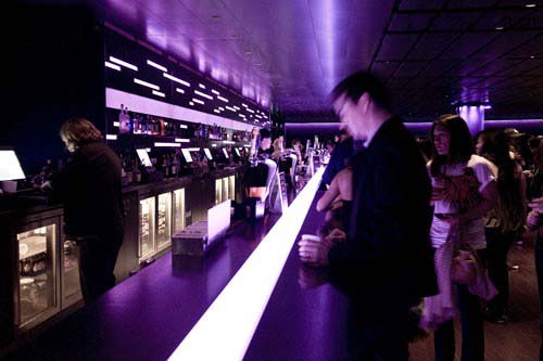 交流總是涉及到身份與場所的界定,Nokia Club也不例外,然而不同的是,這里既有明確身份與場域界定的舞臺空間也有界定模糊的吧臺空間。舞臺空間的絢麗本身就為交流提供了多種可能性,它使交流蘊(yùn)藏于娛樂之中,時而狂熱時而含蓄,臺上與臺下始終有著場域的劃分,而在吧臺空間中,場域變得模糊,交流變的平易近人。柔和的燈光和吧臺簡約的邊緣線勾勒著這個輕松空間的場域邊界,人們要做的則是沉醉其中,暢所欲言。