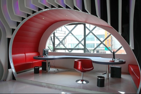 半橢圓型的上網(wǎng)區(qū)很好的利用了樓梯的死角,富有動(dòng)感的白色流線型,打破原有方正的呆板,加上變色LED光源,使空間變出不同的氛圍。