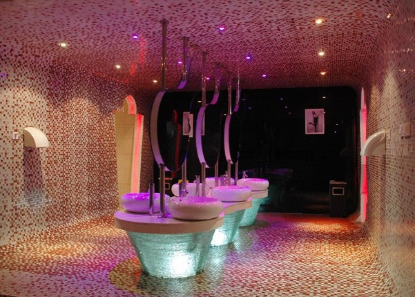 時(shí)光隧道概念的公用洗手間,ktv設(shè)計(jì)公司將LED暗藏地?zé)艉蚅ED射燈相結(jié)合,馬賽克和黑鏡映射出燈光的夢幻。