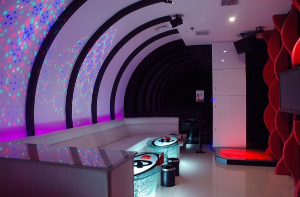 ktv包房設(shè)計(jì)個(gè)性十足,白色的折紙?jiān)赜迷诜块g里加上變色LED光源,營造出另一番風(fēng)情;LED光源造型的時(shí)光隧道概念包房;管道概念的房間,采用LED月花燈使背景產(chǎn)生變化。