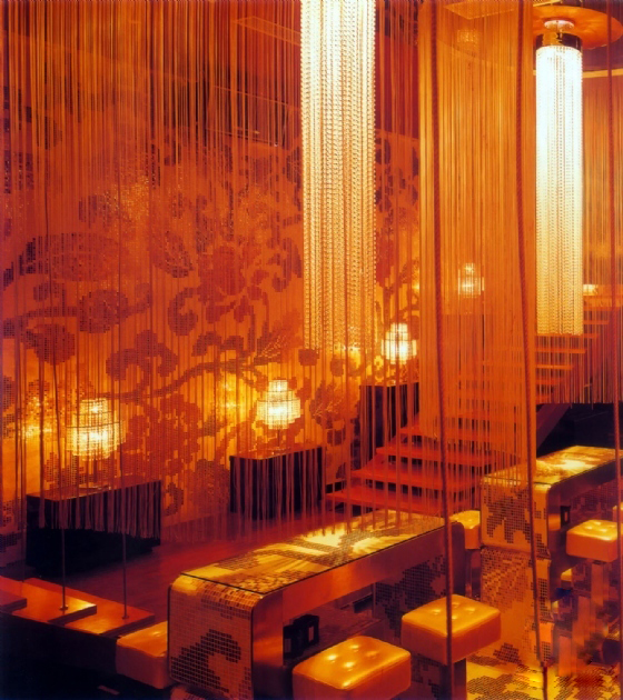 一條流動的馬賽圖案從大堂延伸到電梯廳,引導著你,迷惑著你,大堂及電梯廳在功能上有所劃分,然而在設計上并無刻意的分割,前衛(wèi)的氣氛帶出新潮年輕的感覺,設計師熟練地運用了馬賽克達到感官的獨立與連貫,流動的間斷沒入不同的區(qū)域中,以另一中瑰麗的姿態(tài)浮現,總能帶給人驚奇。慢搖吧截然不同,讓感官神經在幻樂的包圍中漸漸興奮,然而在不經意的抬頭低首中便能發(fā)現,無論是在流動的天花上,還是在透明的卡座間隔的花紋上,都可看到各種延伸。