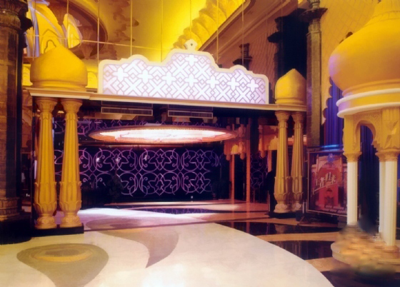 進(jìn)入氣勢輝煌的共享大廳,超高的券形吊頂,宛如盛開的鮮花,兩架弧形樓梯環(huán)抱著如宮廷般華美的亭臺,倒映在碧水中漂浮。亭臺中跳著印度肚皮舞的女郎,婀娜多姿,讓賓客流連忘返。臺階上的豪華精致的“財(cái)富大門”瞬間映入眼簾,給來賓平添一份探索印度神秘文化的渴望之情,浪漫飄渺的浮雕背景烘托著中庭華麗堂皇的氣氛,遙相呼應(yīng)的收銀臺同兩側(cè)古典韻味十足的藝術(shù)造型共同演繹著濃郁的印度風(fēng)情……相信從這個(gè)KTV設(shè)計(jì)效果圖您就能看到那種氣勢。