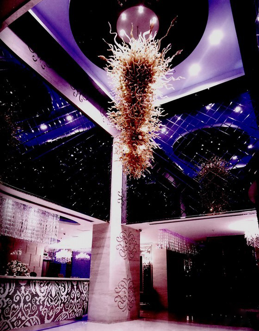 娛樂,在快節(jié)奏的現(xiàn)代生活中已經(jīng)被擺在了不可或缺的位置。KTV設(shè)計師充分考慮到這一點(diǎn),在外墻上運(yùn)用不規(guī)則的幾何圖案,并賦予其不同的亮麗色彩,使人還未踏入此KTV,疲憊就開始得到釋放。大廳天花上的枝藤彰顯著無限的活力,配合著燈光,讓這種活力感頓時傳輸?shù)娇臻g的每個角落。同時,天花上的玻璃將空間放大,帶給客人無限開闊的感覺。燈光,被視為娛樂空間的靈魂。設(shè)計師充分利用幽深的藍(lán)色、魅惑的紫色、熱情的紅色等打造出亦真亦幻的空間,在視覺上帶來震撼的同時,使人充分地釋放厭倦,產(chǎn)生快樂、積極、放縱的情緒??臻g注重情致的打造,從天花的獨(dú)特造型到珠簾的選擇,在燈光的配合下,盡顯奢華美感。不同的區(qū)域選擇不同圖案的地板,產(chǎn)生與周圍環(huán)境相得益彰的最佳效果。珠簾作為一種裝飾,在本案中恰到好處,使得原本的KTV形象得到一種古典雅致的詮釋。