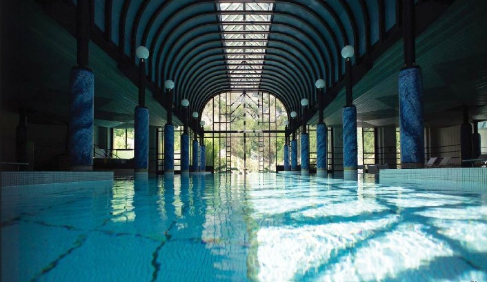 寬敞氣派的游泳池置于巴西利卡式的屋頂下,不由會使人想起古羅馬的沐浴文化