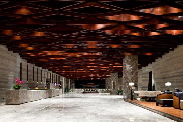 酒店的大堂是對外傳送信息最為重要的第一印象,在酒店大堂設(shè)計上,隱秀山居酒店一改以往酒店金色、米黃色系的傳統(tǒng)手法,而以灰色、咖啡色為主基調(diào),灰木紋大理石、琉璃磚墻面、鋁制木飾面吊頂以及大量使月的古銅色不銹鋼氧化金屬板,低調(diào)中彰顯氣質(zhì)。整個氛圍少的是浮華凜冽,多的是淡定舒適。頂面采用鋁合金吊頂仿木質(zhì)貼膜,造型新穎獨特,如波光粼粼的水面。木與大理石和諧俗配,營造出自然涌動的空間氣場,用現(xiàn)代語匯體現(xiàn)了凝練唯美的中式情懷。同時借助燈光的渲染、窗外景觀的引入等表達了對清雅含蓄、端莊豐華的東方式詩意之美。在這樣的意境下還格外注重細節(jié)設(shè)計,點、線、面進行了嚴(yán)謹(jǐn)?shù)膶Ρ群魬?yīng),疏密關(guān)系,黃金劃分,尤其是材料分割、門扇門套的長寬比例始終維持著一種高瘦的關(guān)系,非常具有震撼力,達到最佳視覺效果。沒有典型的中式元素符號,但體現(xiàn)的是足夠現(xiàn)代的中式生活格局,以近乎天衣無縫的手法演繹了現(xiàn)代版的中式風(fēng)格。