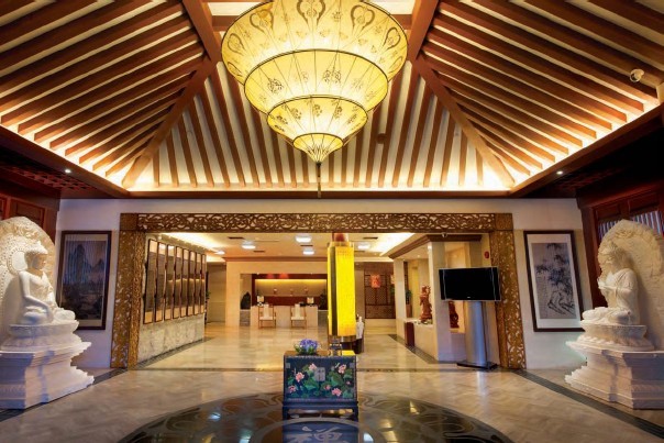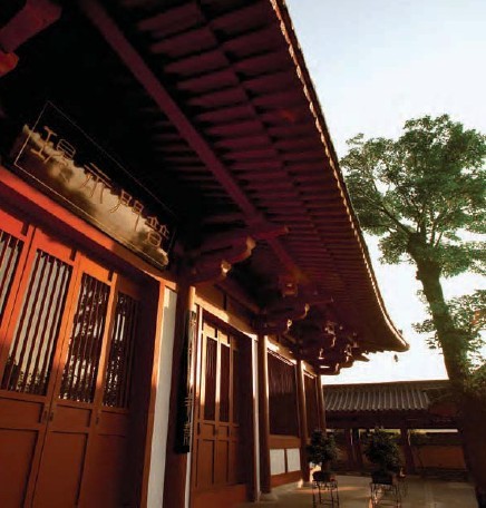 菩提賓舍建筑與華興寺的整體風(fēng)格保持致,從大堂開(kāi)始,滿眼的袈裟黃就為這間以大乘佛教為基調(diào)的私人會(huì)所鋪墊了所有的色調(diào),而私人會(huì)所的英文名也沿用了梵文“Mahayana”(大乘佛教)之意。有道是“世間情薄袈裟黃,深山緲裊梵音響”,袈裟的黃色,讓空間暖暖的,沉靜中蘊(yùn)含能量。空間里充分融人了佛文化的元素,中式傳統(tǒng)建筑的屏風(fēng)家具裝飾都令私人會(huì)所風(fēng)格別致。