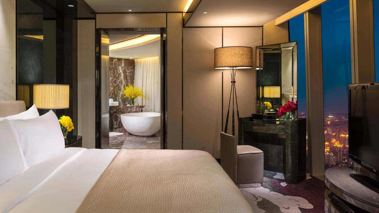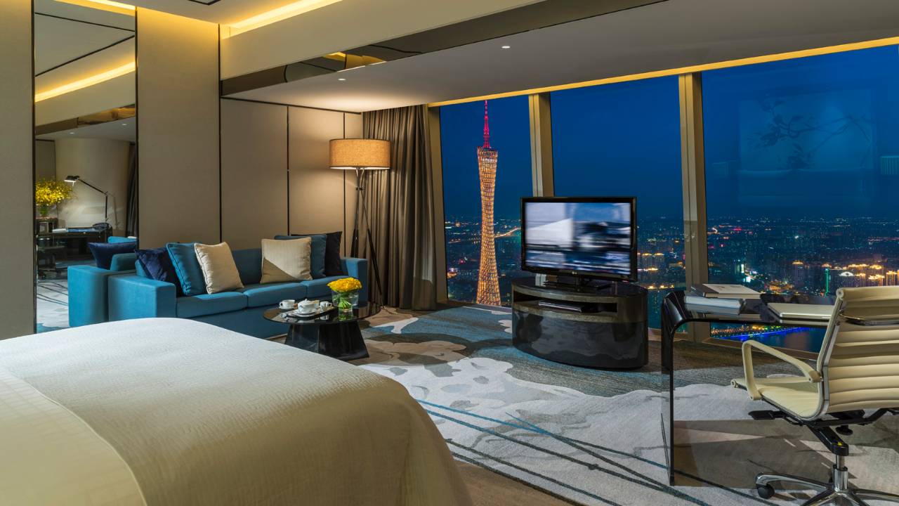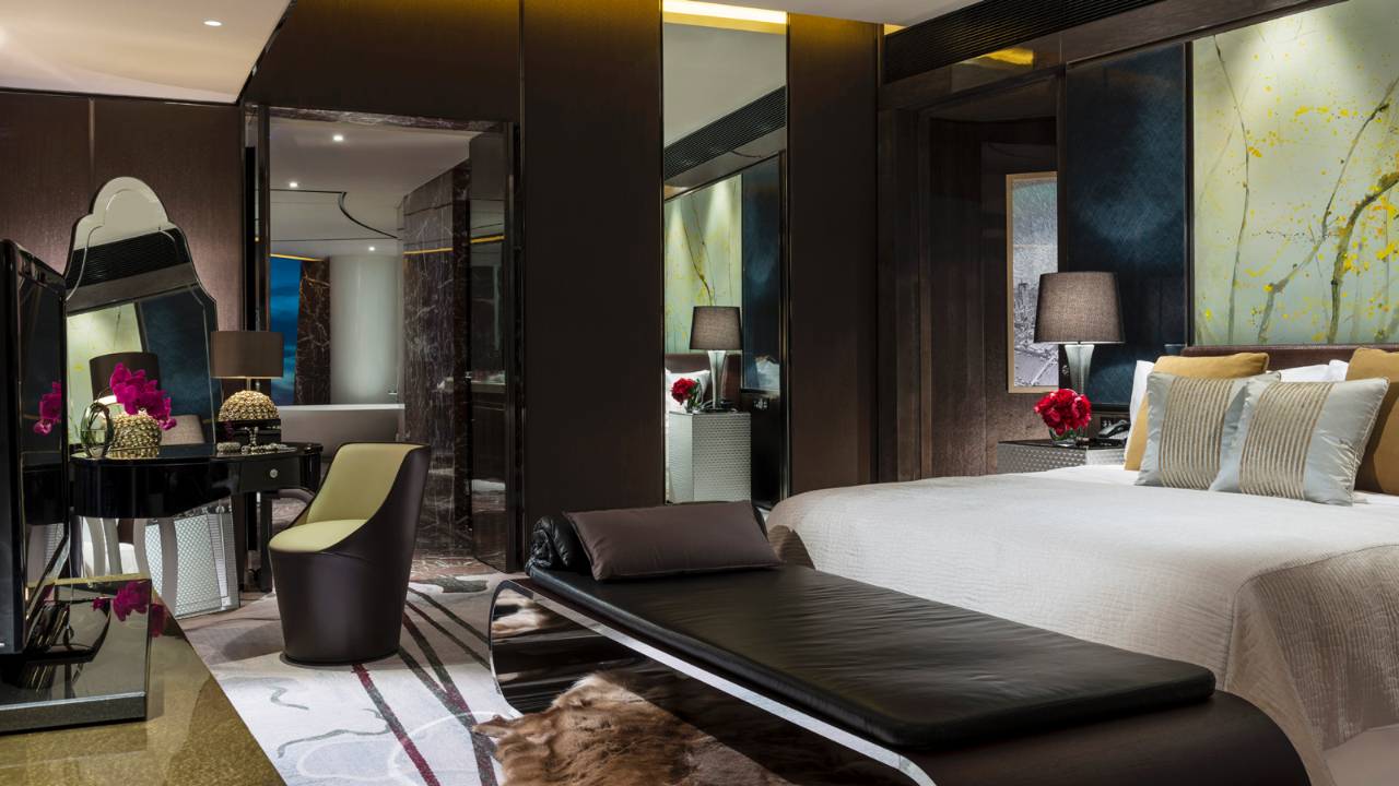 廣州四季酒店客房的設計自裝飾藝術(shù)風(Art Deco)擷取靈感,干凈簡練的線條配搭多層次的奢華內(nèi)飾。寬達6米的建筑開窗令設計師在客房布局及陳設細節(jié)上花費了頗多心思,以便使復雜的功能分區(qū)彼此呼應 .從而更有效地利用空間,并使賓客無阻礙地于高處觀景??紤]到賓客的商旅需求,設計師特別打造了一張大尺寸的書桌,并以手工訂制的紅色軟皮革為材質(zhì),營造出沉靜氣派的辦公氛圍。與此同時,淺咖色的長絨地毯平衡了書桌略顯沉重的色調(diào),并采用由淺入深的圖案柔和過渡了共處一室的工作區(qū)與休息區(qū)。通體軟包背景墻既充當了床頭板,又促成了統(tǒng)一的客房格局。