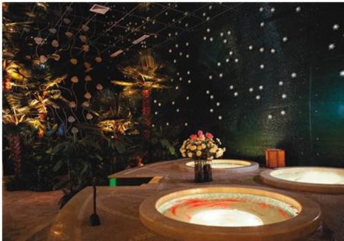 (4)體配置綠化。這是洗浴中心室內(nèi)綠化集中的體現(xiàn),往往以室內(nèi)庭院形式結(jié)合水體、山石共同造景。這種洗浴室內(nèi)庭院可大可小,要結(jié)合具體設(shè)計條件而定。在大型公共空間中如中庭,體配置綠化常常成為主體,旨在室外自然景色室內(nèi)化,以便使人們更好地接近自然,享受自然的沐浴而不受外界氣候變化的影響。體配置綠化也可占據(jù)廳的一側(cè)或一角,結(jié)合休息區(qū)布置成片綠化。甚至在一些邊角不規(guī)則空間無法作為功能使用時,也可作為綠化景觀空間,能露天最好(在頂層或僅有一層),不能露天的利用燈光效果也會產(chǎn)生小天井、小庭院的感覺。在現(xiàn)代高層建筑和超高層建筑常常會設(shè)置空中花園、高空中庭或高空邊庭,都是以體的配置綠化,達(dá)到室外化的設(shè)計手法。