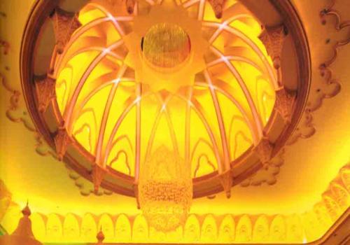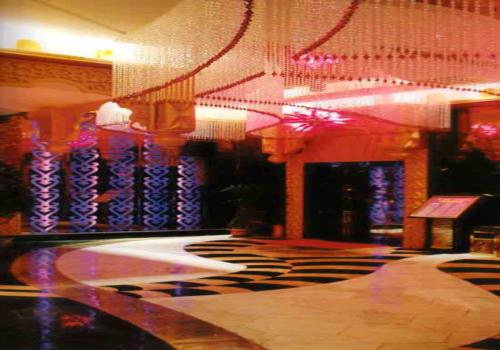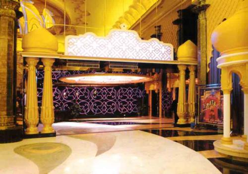 進入氣勢輝煌的共享大廳,超高的券形吊頂,宛如盛開的鮮花,兩架弧形樓梯環(huán)抱著如宮廷般華美的亭臺,倒映在碧水中漂浮。亭臺中跳著印度肚皮舞的女郎,婀娜多姿,讓賓客流連忘返。